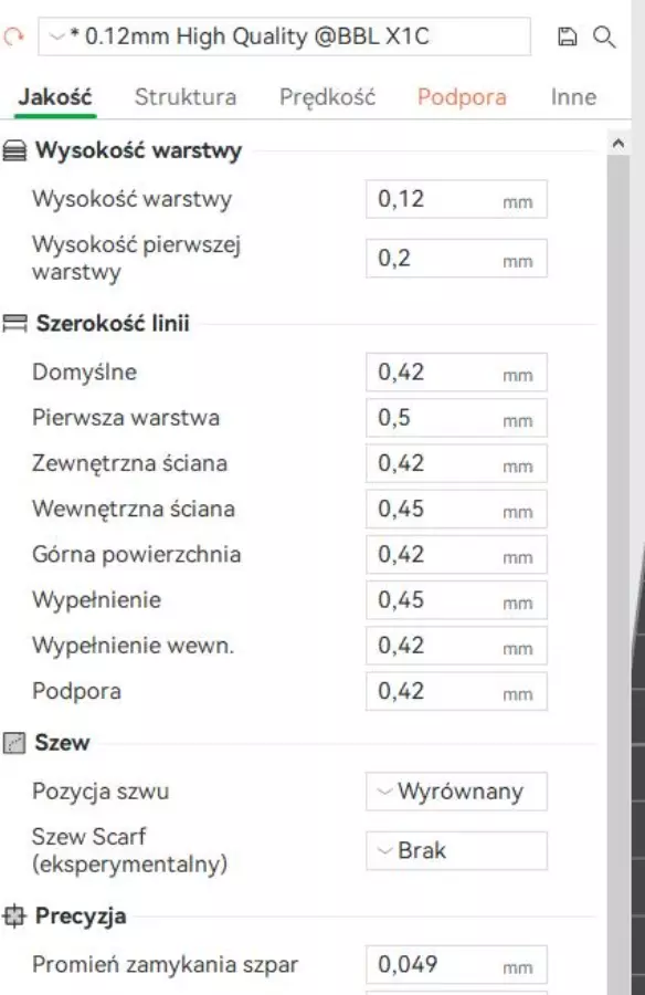 - Objętość modelu: Większe modele wymagają większego zużycia materiału.